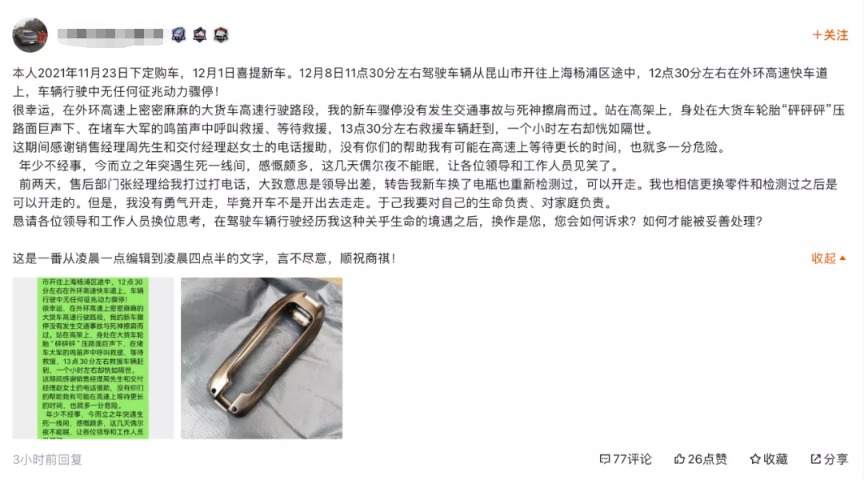 还有车主表示,自己12月1日提的车,结果12月8日,新车就在行驶过程中骤停在上海的外环高速上,与死神擦肩而过。