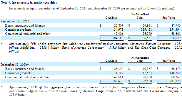 在股市投资组合中,据伯克希尔哈撒韦三季报,大约 68% 的总公允价值集中在美国的四家公司(美国运通公司183亿美元;苹果公司1204亿美元;美国银行313亿美元和可口可乐公司219亿美元)。
