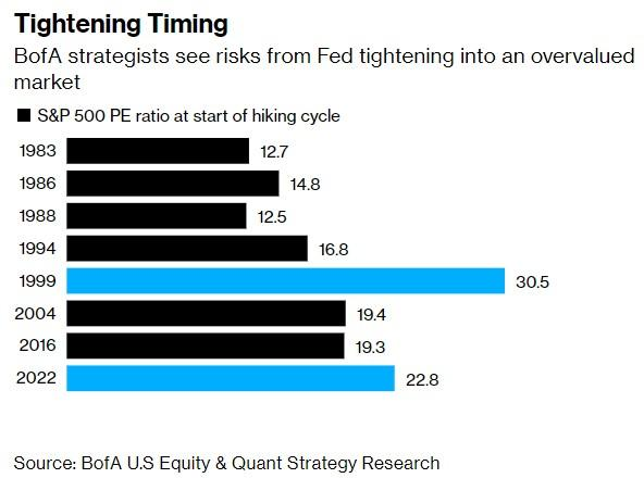 “在本轮首次加息之前,标普500指数的估值比除了1999-2000年以外的任何一个加息周期都要高。”他们补充道。
