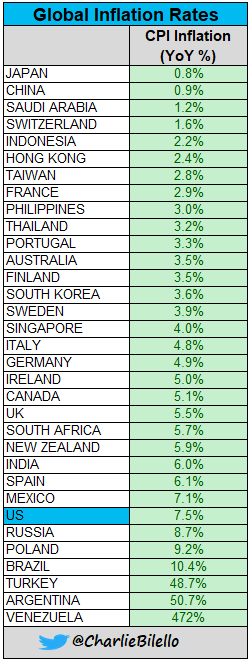 不断爆表的通货膨胀已经取代了低迷的经济增长,成为了许多经济体的首要担忧——当美国CPI同比涨幅在1月达到7,5%刷新近40年高位的同时,世界多地的人们也正饱受通胀之苦:德国CPI来到了4.9%、英国CPI达到了5.5%,巴西CPI突破了10%,土耳其CPI接近了50%……