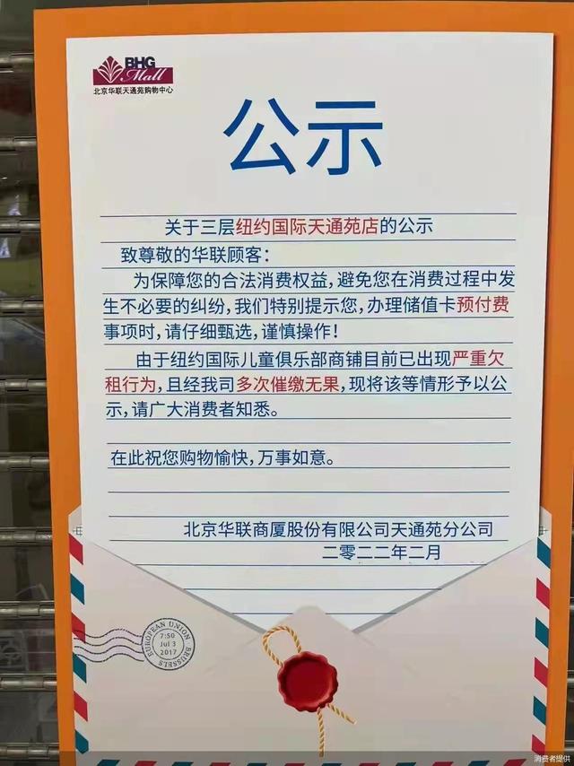 2月20日,北京商报记者接到消费者投诉【进入黑猫投诉】,位于天通苑华联BHGMall和双井富力广场的NYU纽约国际儿童俱乐部(以下简称“纽约国际早教”)突然闭店,均以商场消防检查为由暂停所有课程。记者在调查过程中向相关商场了解到,上述门店已经拖欠租金或物业费数月,目前均联系不到相关负责人。