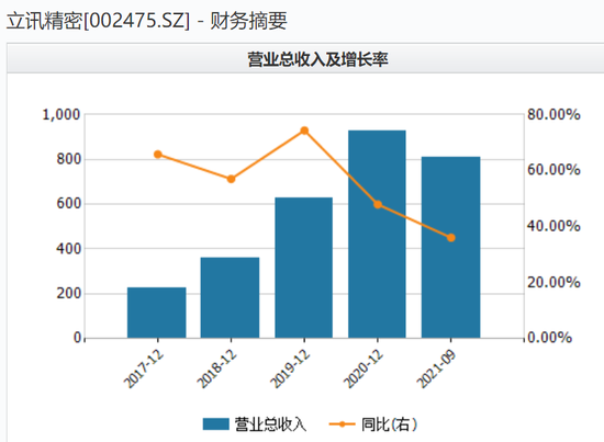2018年至2020年,立讯精密营收分别为358.5亿元、625亿元、925亿元,归母净利润分别为27亿元、47亿元、72亿元,其中苹果贡献的收入占比分别为44.85%、55.43%、70%,逐年递增。