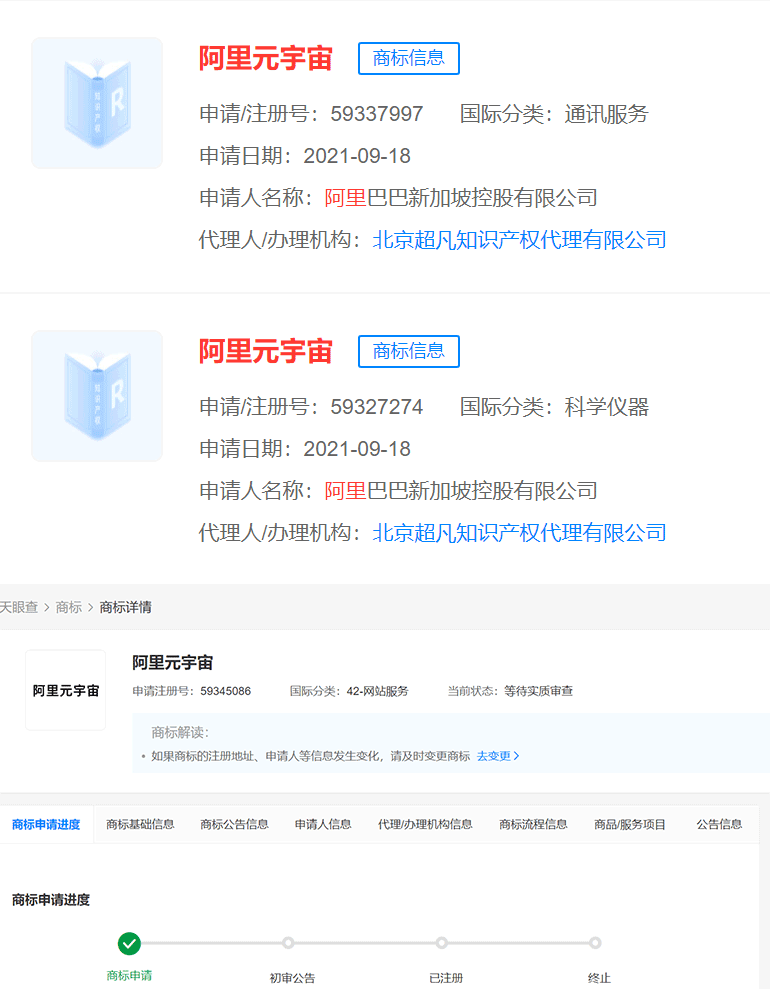 天眼查显示,阿里新加坡控股有限公司申请注册了“阿里元宇宙”、“淘宝元宇宙”等商标,商标国际分类涉9类科学仪器、41类教育娱乐等,目前商标状态为等待实质审查。