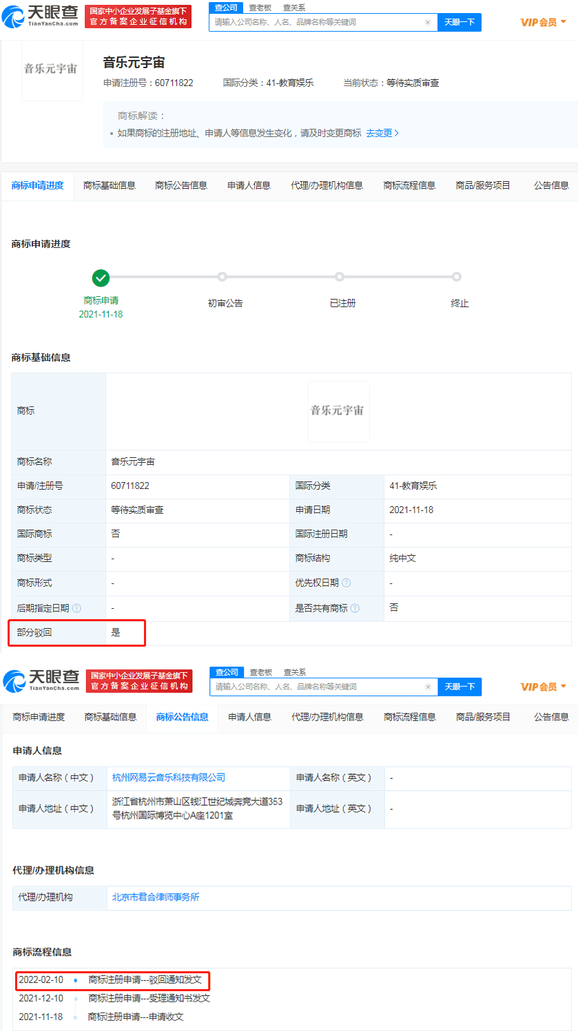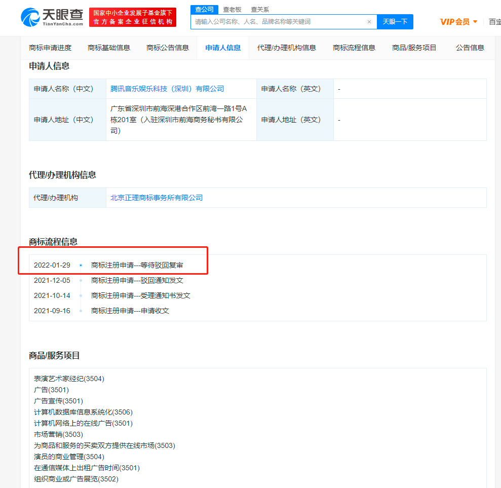 天眼查显示,全民K歌关联公司腾讯音乐娱乐科技(深圳)有限公司申请的多个“律动元宇宙”商标,状态变更为“等待驳回复审”,国际分类包括广告销售、科学仪器、教育娱乐等,商标申请于2021年9月。