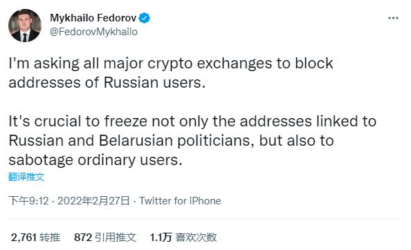 乌克兰副总理Mykhailo Fedorov周日在推特上表示,他请求“所有主要的加密货币交易所阻止俄罗斯用户的地址”。Fedorov不仅呼吁要冻结与俄罗斯和白俄罗斯政客有关的加密地址,还希望冻结普通用户的地址。
