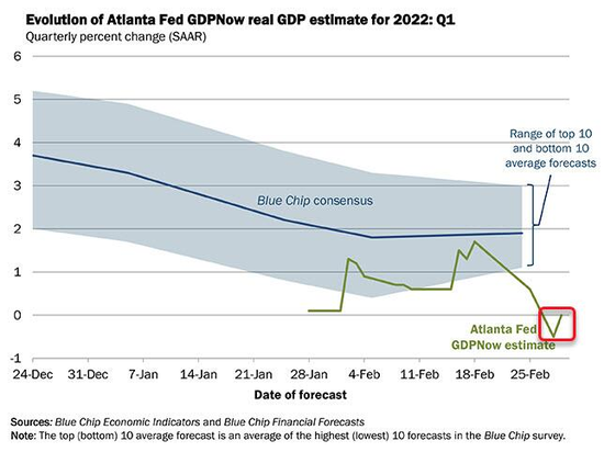 零对冲报道称,现在美国第一季度GDP预期将为零,滞涨担忧上升。