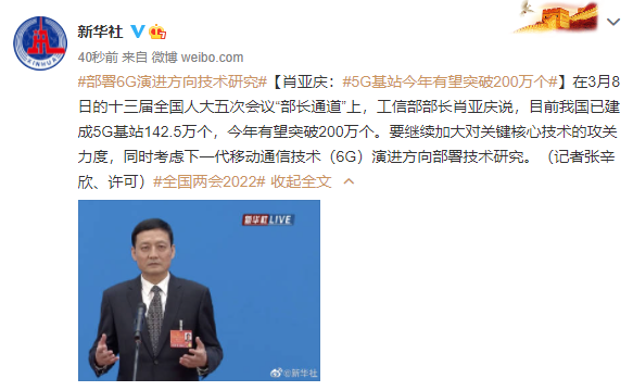 在3月8日的十三届全国人大五次会议“部长通道”上,工信部部长肖亚庆说,目前我国已建成5G基站142.5万个,今年有望突破200万个。要继续加大对关键核心技术的攻关力度,同时考虑下一代移动通信技术(6G)演进方向部署技术研究。【责任编辑/江小白】
