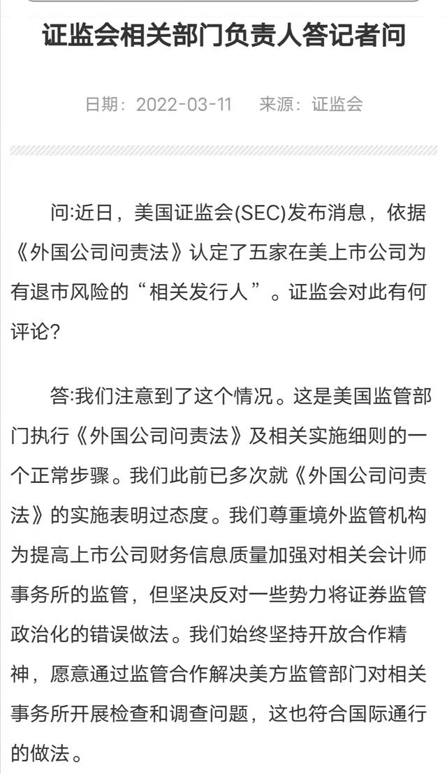 3月11日,针对美国证监会(SEC)据《外国公司问责法》认定五家在美上市公司为有退市风险的“相关发行人”,证监会凌晨回应。