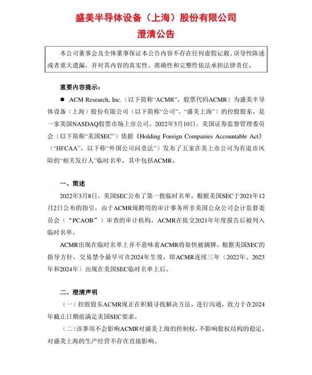 “ACMR于2022年3月1日提交了年度报告,因此出现在SEC的第一批临时名单上。ACMR出现在临时名单上并不意味着ACMR将很快或根本不会被摘牌。根据美国证券交易委员会SEC的指导方针,交易禁令最早可在2024年生效,即发行人连续三年(2022年、2023年和2024年)出现在SEC临时名单上后。”