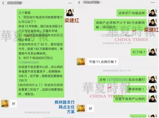 同样经过公证的多则聊天记录截图显示,梁建红曾向时任工行南宁市枫林路支行网点主任方某发送微信,安排方某给储户打电话,推进虚构的不良资产业务,并要求储户存款。