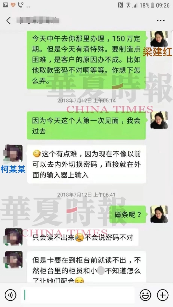 2018年7月12日,梁建红再次向柯某某发微信称,“今天中午去你那里办理,150万定期。但是今天有滴(点)特殊。要制造点困难,是客户的原因办不成。比如他取款密码不对啊等等。你想下怎么弄”。柯某某随后回应称,“这个有点难,因为现在不像以前可以去内外切换密码,直接就在外面的输入器上输入”。她还提到怎么让柜员配合的问题。