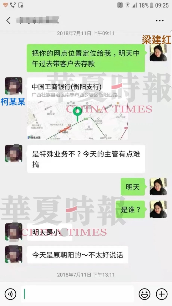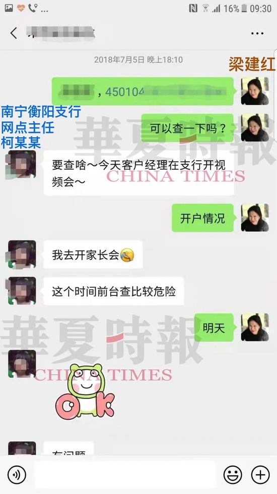 有关聊天记录截图显示,2018年7月5日,梁建红向工行南宁市衡阳支行的网点主任柯某某发送被害储户的姓名和身份证号码,要求查询储户的开户情况。柯某某随即回复称,“这个时间前台查比较危险”。