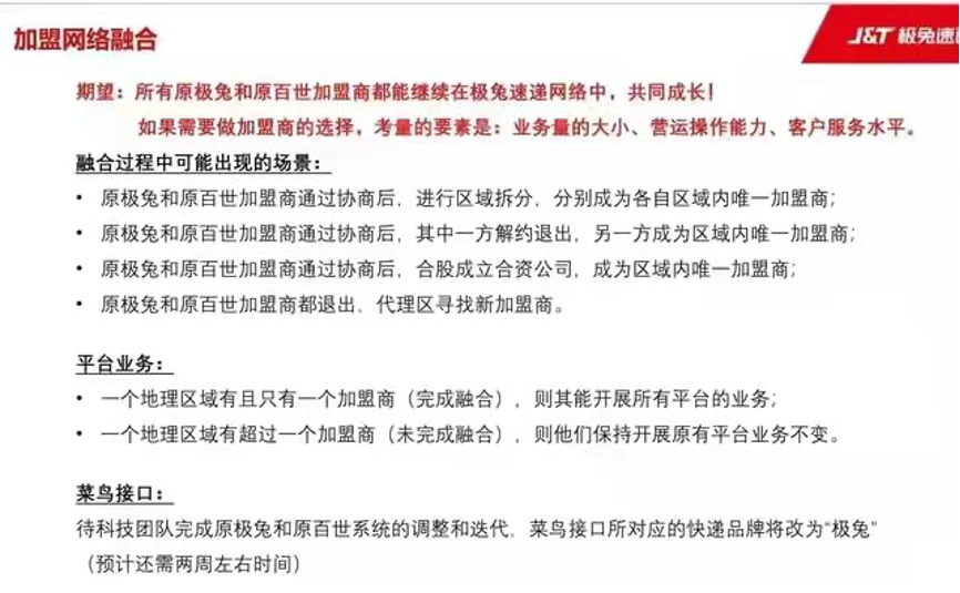 2021年12月中旬,一份关于极兔和百世两网融合的方案在网络流传开来,对两网融合过程中可能出现的场景,极兔提出了四种方案:原极兔和原百世加盟商通过协商后,进行区域拆分,分别成为各自区域内唯一加盟商;原极兔和原百世加盟商通过协商后,其中一方解约退出,另一方成为区域内唯一加盟商;原极兔和原百世加盟商通过协商后,合股成立合资公司,成为区域内唯一加盟商;原极兔和原百世加盟商都退出,代理区寻找新加盟商。