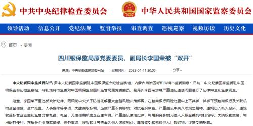 4月11日,据中央纪委国家监委驻中国银保监会纪检监察组、内蒙古自治区呼和浩特市监委消息:日前,中央纪委国家监委驻中国银保监会纪检监察组、呼和浩特市监委对中国银保监会四川监管局原党委委员、副局长李国荣涉嫌严重违纪违法问题进行了纪律审查和监察调查。