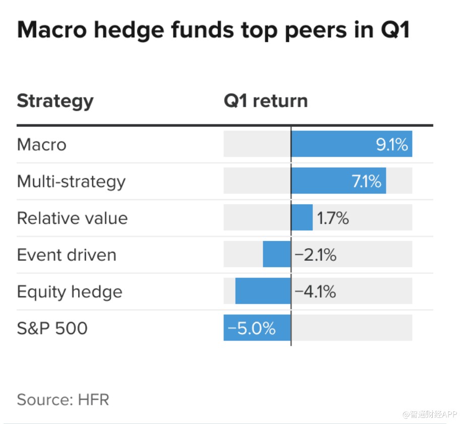 根据HFR的数据,对冲基金经理很好地利用了第一季度风险资产的动荡,总体上实现了0.3%的微弱收益。HFR表示,包括商品交易顾问和系统性基金在内的宏观策略在此期间表现出色,回报率达到9.1%,这是自1993年以来最好的第一季度业绩。