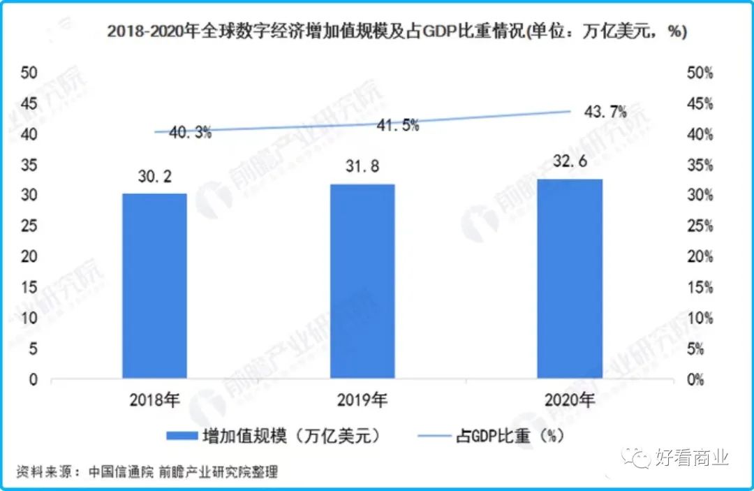 受益于云计算等新一代信息技术的发展,传统产业加速向数字化转型。据前瞻产业研究院的数据,2018-2020年全球数字经济规模持续上涨,2020年达到32.61万亿美元,占GDP比重为43.7%。