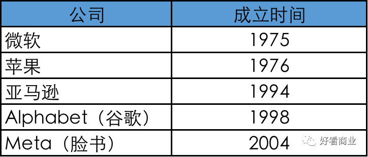 他们都成功穿越了互联网、移动互联网,最老的微软如今已经47岁,最年轻的Meta也已经年过18。