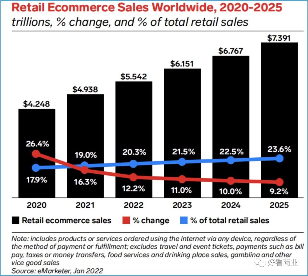 据eMarketer的报告,2022年全球电商销售额预计将首次突破5万亿美元,占整体零售总额的1/5;2025年,这个数字或将突破7万亿美元。
