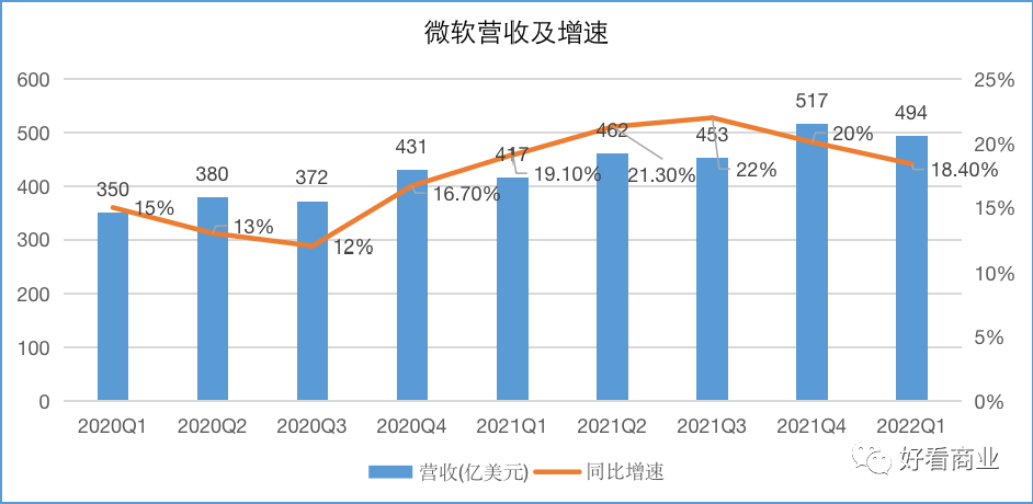 相比之下,微软是美国五大科技巨头中表现最稳的一家。一年多来,其季度营收持续保持20%左右的同比增幅。