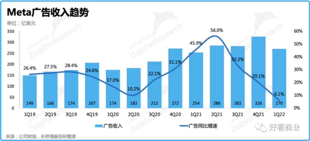 广告是Meta收入的基本盘,目前营收占比超96%。今年Q1,Meta广告收入270亿美元,同比增长6.1%,低于市场预期的273亿美元;环比下滑17%。而其广告业务增速下滑的态势已经持续了一年时间。