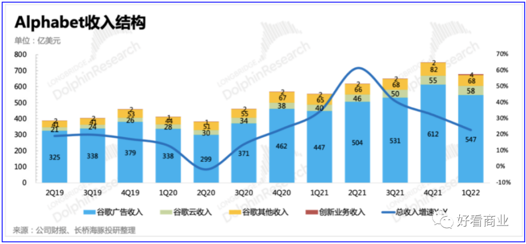 具体来看,2022年Q1,Alphabet营收同比增长23%,其中占比超8成的广告业务同比增长22.3%,均创五个季度以来最低增速;广告业务环去年Q4比下滑10.6%。