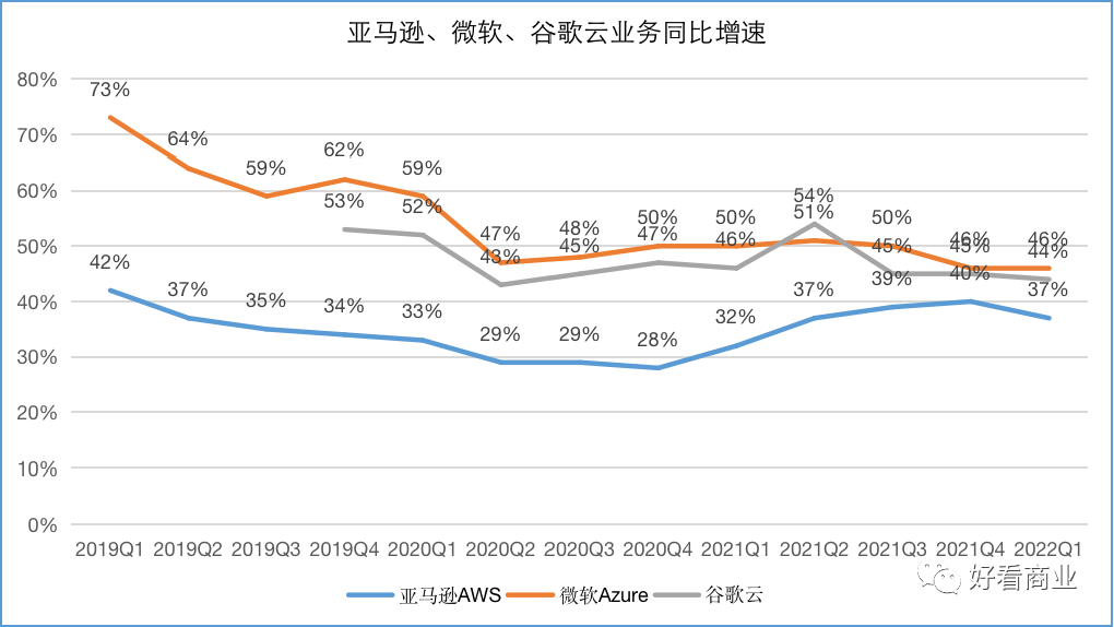 过去一年多时间,微软Azure、亚马逊AWS、谷歌云每个季度仍保持30%-50%的高速增长。