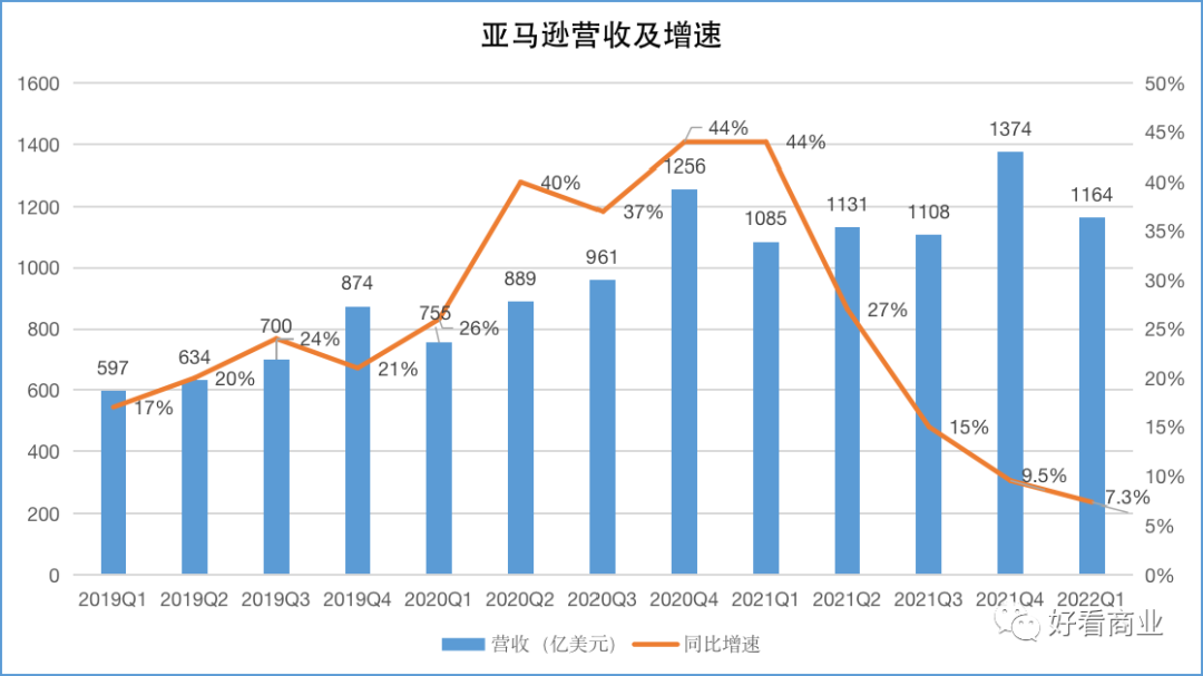 今年Q1,亚马逊增速大跌至7.3%。这是亚马逊20年来的最低增速。去年同期,亚马逊实现了44%的增长。