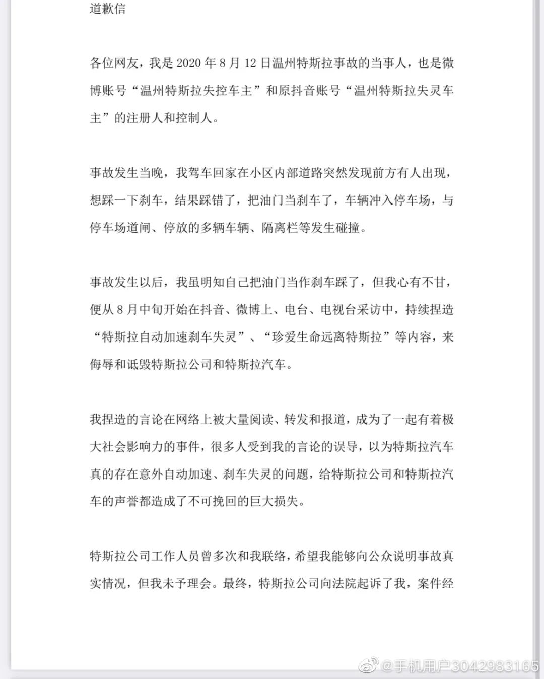最后该当事人表示已经认识到了自己的错误,向特斯拉公司和网友道歉,称“不要被自己的私心和他人的蛊惑而蒙蔽了双眼”。