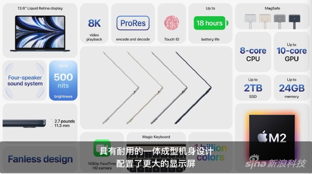 MacBook Air外观和去年下半年发布MacBook Pro有些相似,圆润边角以及刘海屏幕。MacBook Air有四种配色分别是银色、深空灰、午夜色、星空色、Magsafe也回来了。
