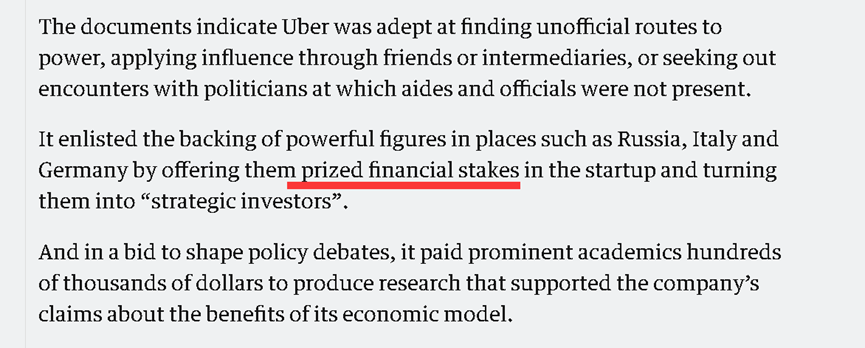 甚至于,优步还会通过相关官员的亲朋好友来影响这些官员做出有利于优步的决策,并会给予相关人员经济好处,比如公司的股票,或是干脆把他们变成“战略投资人”。