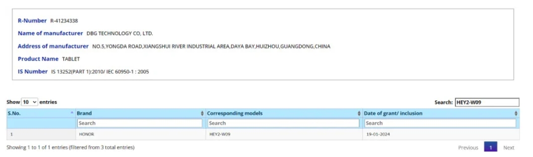 BIS认证于1月19日授予,型号为HEY2-W09,与IMDA之前在新加坡颁发的认证相匹配。