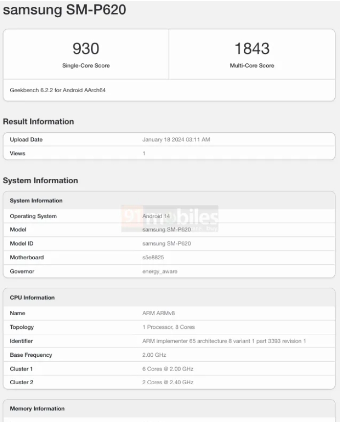 Galaxy Tab S6 Lite 2024 还有一个 Wifi 版本。Wi-Fi 版本的型号为 SM-P620。几周前我们已经遇到过这个模型。Geekbench 结果证实,新的 Galaxy Tab S6 Lite 2024 将配备 Exynos 1280 SOC。