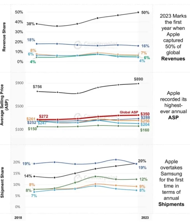 苹果激增背后的原因可能是随着时间的推移,用户越来越渴望获得更优质的设备,实际上统计数据证实了这一点。三星低端设备的出货量和销售率均有所下降。苹果2023年年营收达到2030亿美元,创下新纪录。