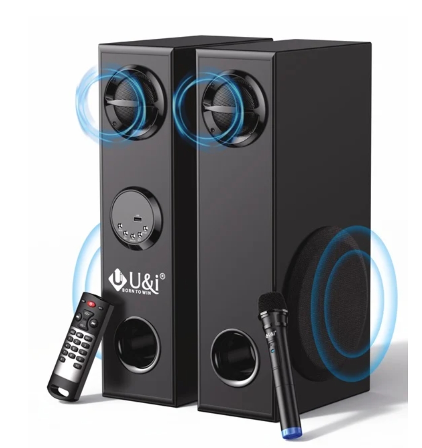 接下来是U&i Mini Twin Tower(UiBS-5166),专为卡拉OK爱好者量身定做。这些蓝牙书架式扬声器配有无绳麦克风,非常适合即兴合唱。它采用强大的 120 瓦系统,包括 4 英寸中音驱动器和 8 英寸侧射式低音扬声器,可提供动态声音。凭借 FM、AUX 输入和 USB 连接,以及预设的声音配置文件,它非常适合举办派对。