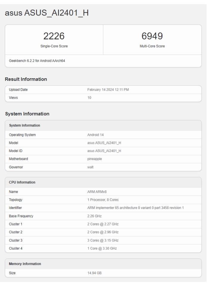 在软件方面,根据 Geekbench 列表,Zenfone 11 Ultra 将提供 Android 14。在单核和多核测试中,该设备分别获得了 2226 分和 6949 分。