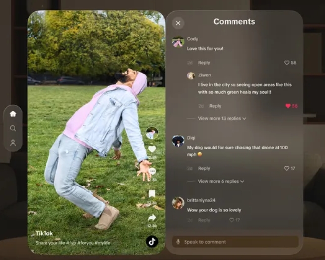 该应用程序的布局会提醒您很多在手机上使用 TikTok 的情况,视频垂直播放,点赞、评论和分享的按钮就在那里。但是,由于 Vision Pro 上的额外空间,TikTok 可以更轻松地查看评论和创作者信息,而不会妨碍视频。