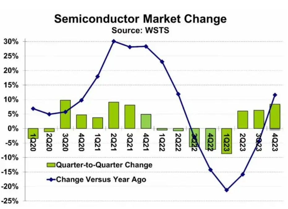 目前,全球半导体销售率创历史新高。WSTS的最新信息表明,全球半导体销售额最近达到了过去20年来的最高水平。2023年第四季度,全球半导体零部件销售额较上一季度增长8.4%,与去年同期相比显著增长11.6%。