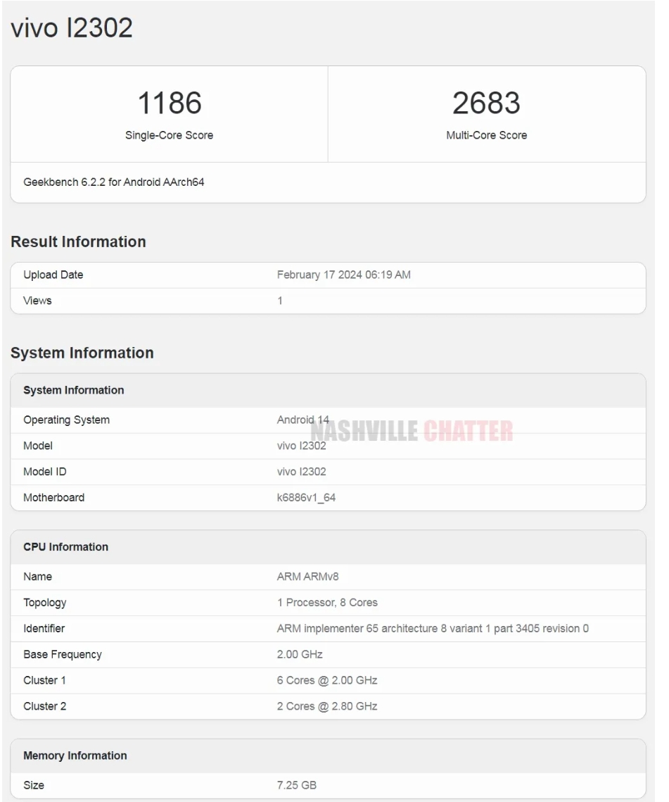 iQOO Z9 列在 Geekbench 数据库中,型号为 Vivo I2302。它提到了代号为 k6886v1_64 的主板,该设置包括主频为 2GHz 的 6 个内核和其他 6 个主频为 2.80GHz 的内核。这对应于天玑 7200 芯片组。该设备板载 8GB RAM,我们可以期待在发布时有更多选择。它预装了开箱即用的 Android 14 操作系统。