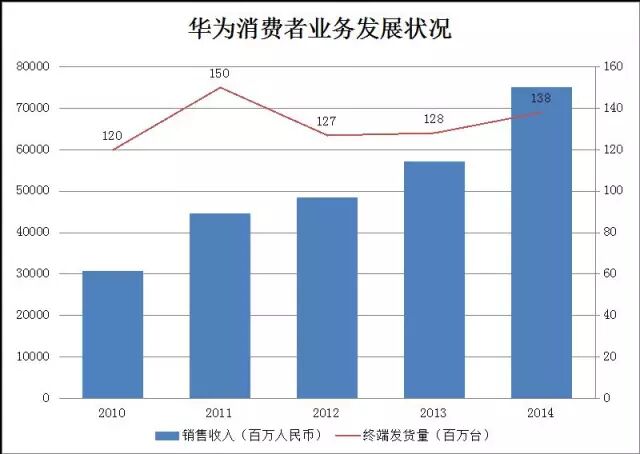 华为和中兴的消费者业务收入,主要是来自于手机终端销售,对比两大厂商在2014年财报中的相关信息,中兴不仅在收入上远落下风,其手机业务15.4%的毛利率水平(集团整体毛利率31.56%)基本是处于亏损运营的状态。