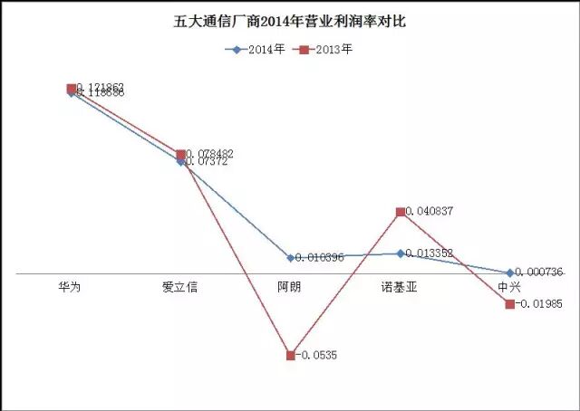 五大通信厂商2014年的整体营业利润率(Operating Profit)的对比结果如下图所示: