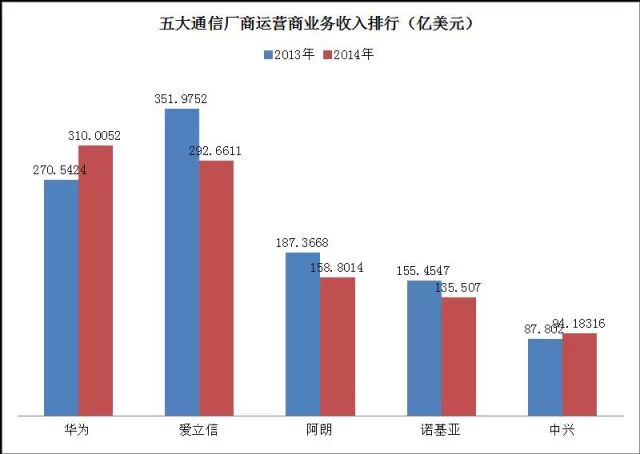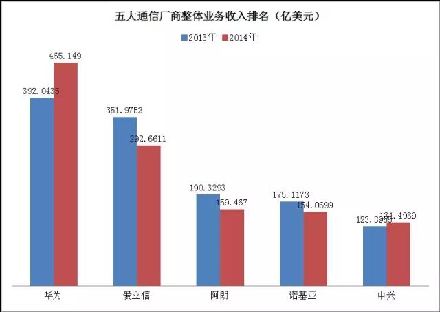 根据财报数据,五大通信厂商在2013年与2014年的整体营收变化及排名情况如下图所示: