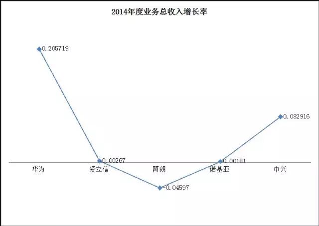 在公司整体业务收入上与2013年相比,五大通信厂商在2014年的排名没有发生任何变化,华为继2013年实现对爱立信的超越之后在2014年进一步加大 了领先优势,排在最后的中兴与夹在中间的欧洲三强之间的差距也在进一步减少。再横向对比五大通信厂商基于本币的年度增长率,也可以看到华为与中兴在 2014年的增长幅度远远大于停滞不前的欧洲三强,此消彼长之间中国厂商对欧洲三强两头夹击的势头非常明显。