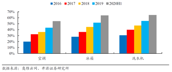 其次,家电线上渠道占比逐年上升,电商已经成为渠道主力。我们认为,线上渠道对于线下渠道的替代,几乎是一个必然趋势,因为人们消费习惯很明显已经越来越倾向网上下单,疫情之下这一趋势更得以加强。目前,白色家电空冰洗线上已经提升至近一半份额,小家电线上占比更是恐怖的达到80%。