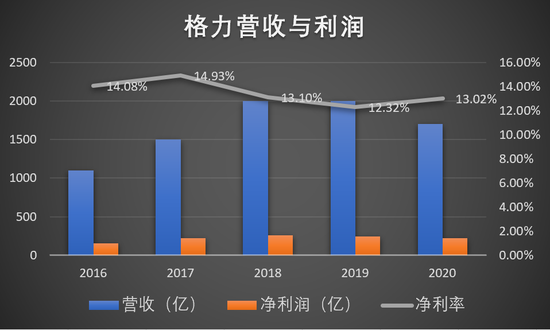 而股价涨跌的直接原因就是现阶段业绩的好坏和预期业绩的高低。从下图近几年美的、格力营收和利润来看,确实很容易解释,就是因为格力自2018年以来业绩滞胀,而美的稳定增长,迎来戴维斯双击。
