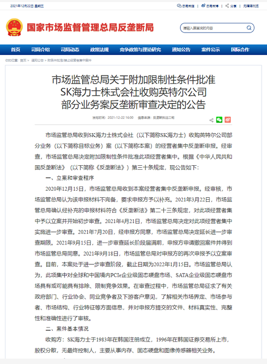 2020年12月15日,市场监管总局收到本案经营者集中反垄断申报。经审核,市场监管总局认为该申报材料不完备,要求申报方予以补充。2021年3月22日,市场监管总局确认经补充的申报材料符合《反垄断法》第二十三条规定,对此项经营者集中予以立案并开始初步审查。2021年4月21日,市场监管总局决定对此项经营者集中实施进一步审查。2021年7月20日,经申报方同意,市场监管总局决定延长进一步审查期限。2021年9月15日,进一步审查延长阶段届满前,申报方申请撤回案件并得到市场监管总局同意。2021年9月18日,市场监管总局对申报方的再次申报予以立案审查。目前,本案处于进一步审查阶段,截止日期为2022年1月15日。市场监管总局认为,此项集中对全球和中国境内PCIe企业级固态硬盘市场、SATA企业级固态硬盘市场具有或可能具有排除、限制竞争效果。在审查过程中,市场监管总局征求了有关政府部门、行业协会、同业竞争者及下游客户意见,了解相关市场界定、市场参与者、市场结构、行业特征等方面信息,并对申报方提交的文件、材料真实性、完整性和准确性进行了审核。