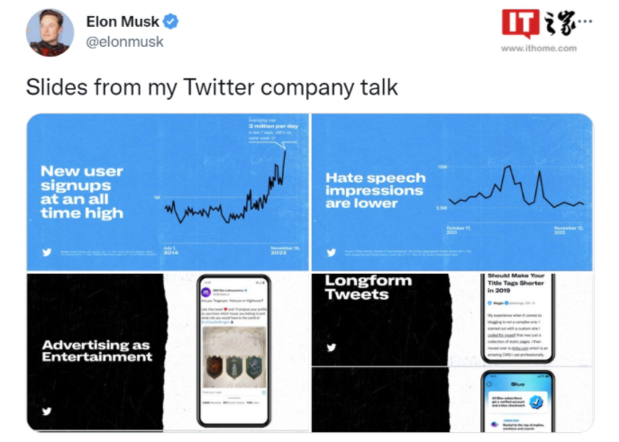 11 月 27 日消息:社交媒体公司 Twitter 首席执行官埃隆・马斯克(Elon Musk)今日公布了数张他在公司演讲的幻灯片。