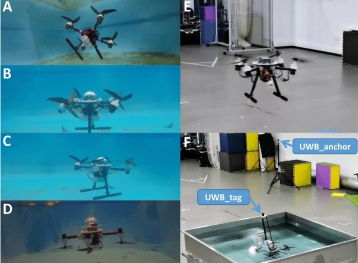 对此,团队研发了水空跨域巡航器原型机“同济飞鱼”。其采用了搭载水空两用推进单元和舵面倾转机构的四旋翼构型设计,重量为 1.63 千克,轴距为 380 毫米,具备跨域穿梭能力,又具备双域巡航能力,可在空中悬停 6 分钟,在水下巡游约 40 分钟。