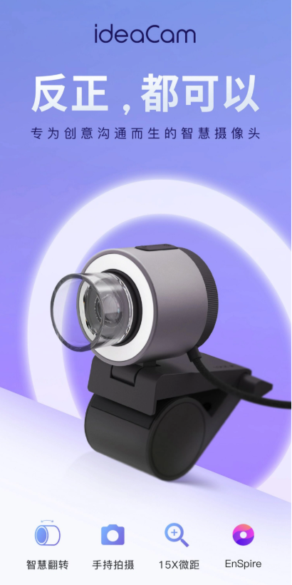 此外,ideaCam 支持手持移动拍摄,而且底座配备了 1/4 螺口,可搭配脚架使用;人物 / 实物更可快速识别,自动感应调节画面方向。