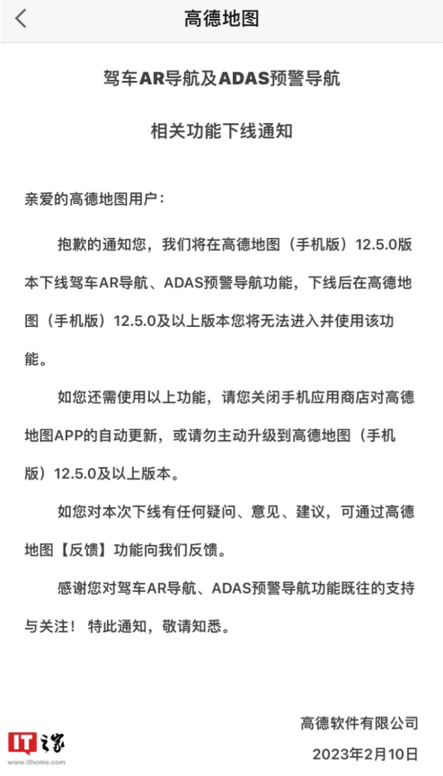 2 月 13 日消息,高德软件有限公司 2 月 10 日发布了《驾车 AR 导航及 ADAS 预警导航相关功能下线通知》。