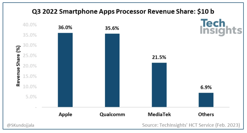 原标题:TechInsights:2022 年 Q3 全球智能手机应用处理器市场苹果、高通、联发科前三